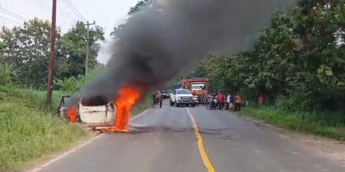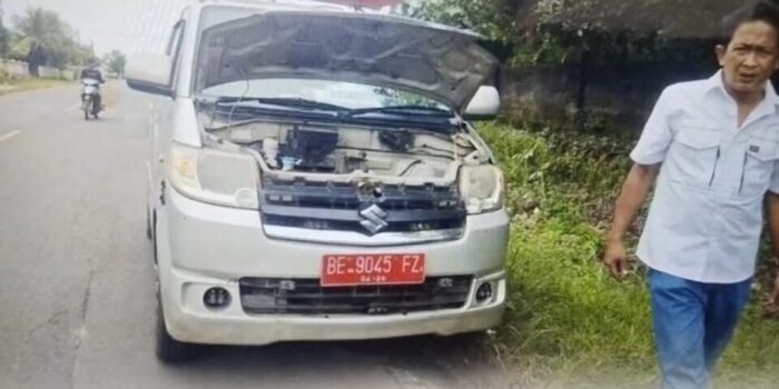 Lampung Utara, Kabarlampung.co – Satu unit mobil Toyota Avanza Veloz tahun 2012 warna silver dengan nomor polisi BE 1034 EF hangus terbakar