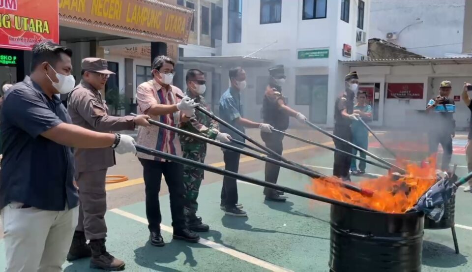 Pemusnahan itu dilaksanakan di halaman Kantor Kejari Lampung Utara, Kamis 16 Oktober 2025, dihadiri Forkompinda dan intasi terkait. Barang bukti di antaranya narkoba, sejata tajam, senjata api, dan handphone.