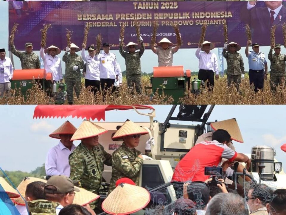 Lampung Utara, Kabarlampung.co – Menteri Pertahanan, dan Menteri Pertanian hadiri Panen raya kedelai Garuda merah putih hasil dari kolaborasi pihak Swasta dan Kepala Staf Angkatan Laut, Kasal di lahan seluas 30 Hektar, Desa Madukoro, Lampung Utara, Rabu 29 Oktober 2025.
