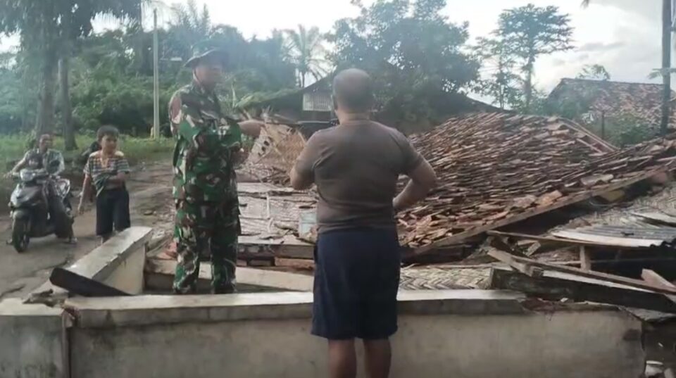 Sejumlah bangunan porak-poranda, atap beterbangan, dan material rumah berserakan di jalan serta pekarangan warga.